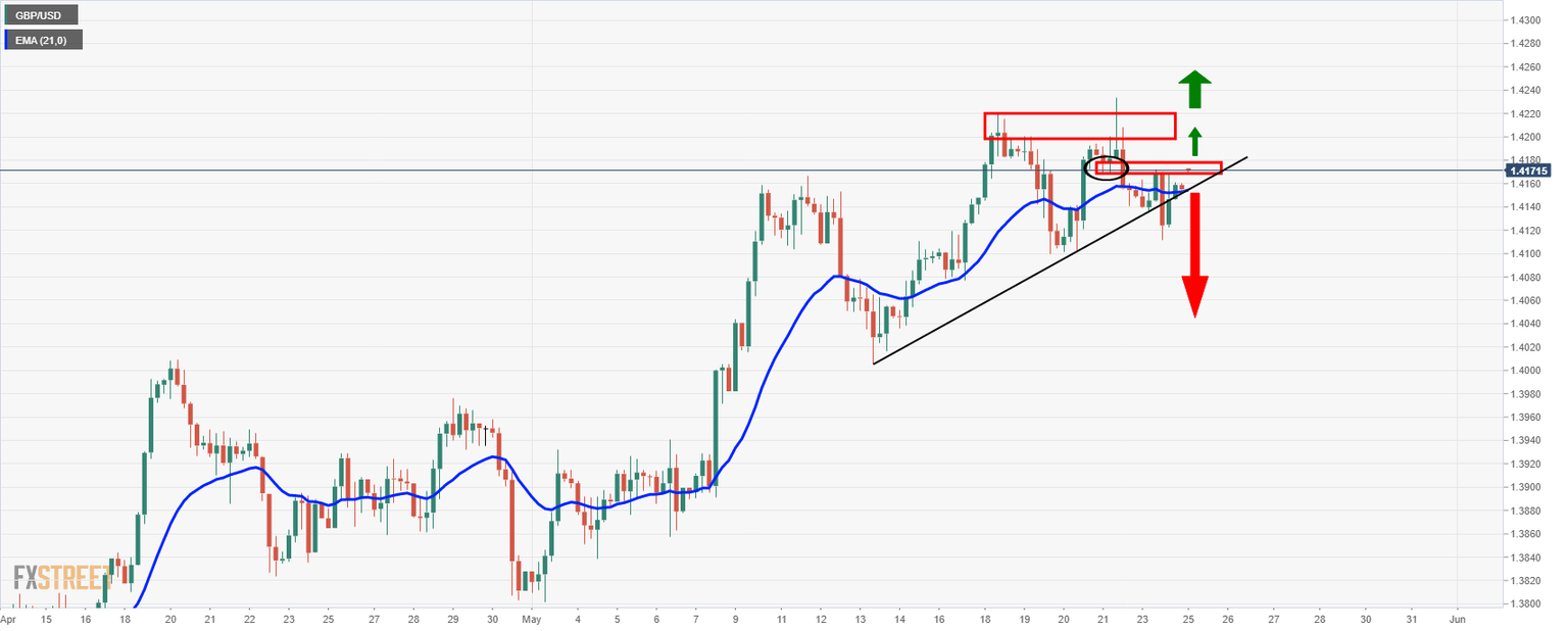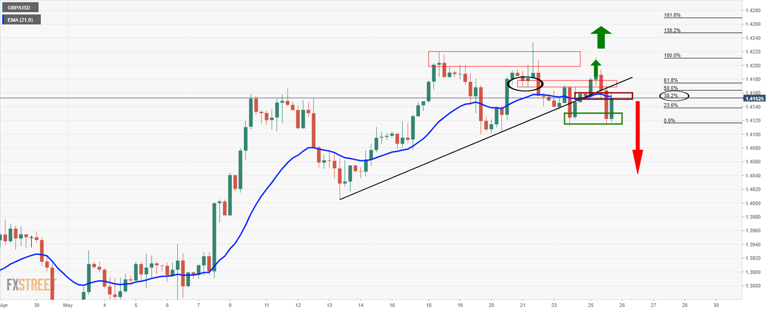 As per the prior analysis, GBP/USD Price Analysis: It is make-or-break time, where cable was on the verge of either a significant upside continuation or a downside breakout, the bears have stepped in and the focus is on the downside below what was dynamic support as follows: