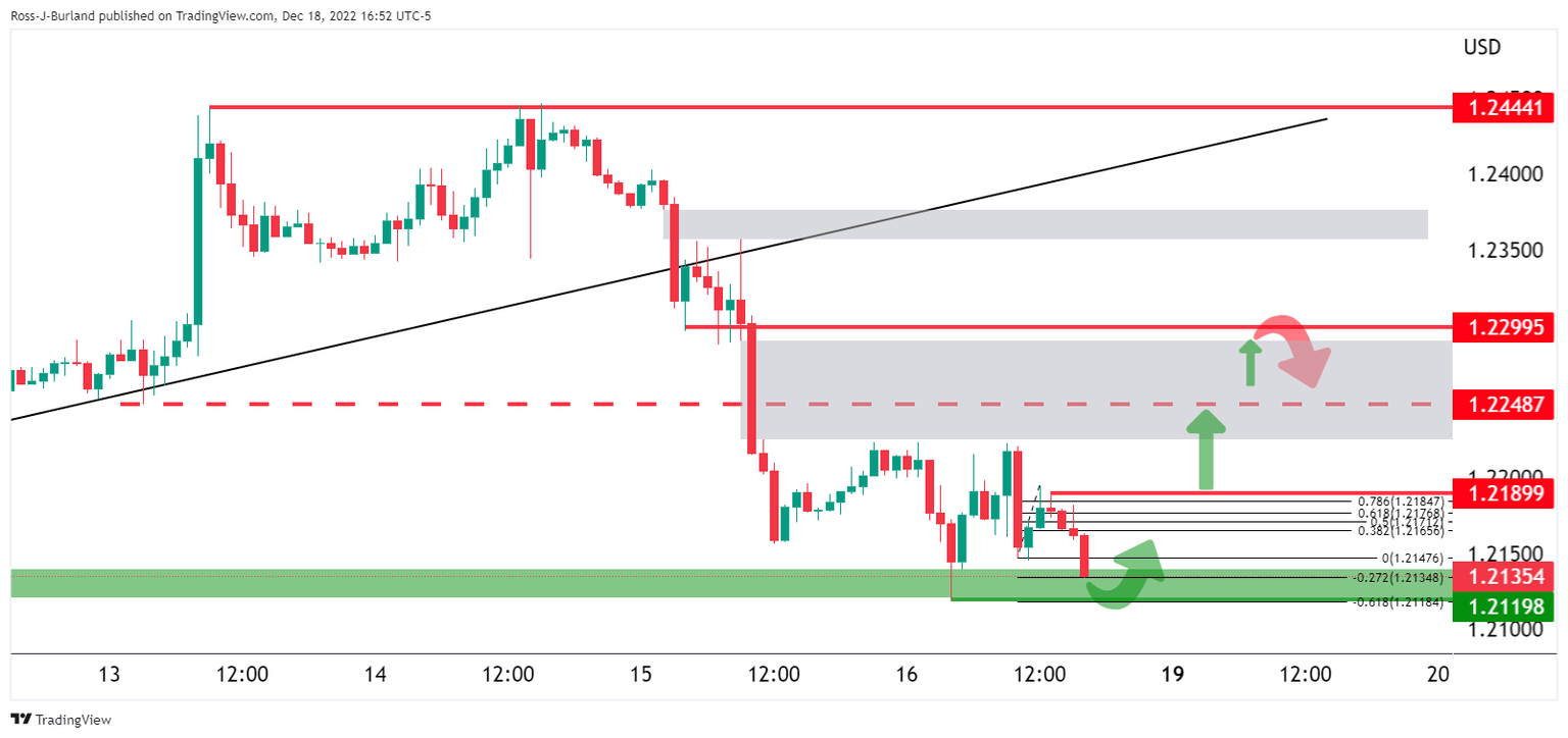 GBP/USD is moving higher in the open, up some 0.2% having popped from a low of 1.2135 and reaching 1.2159 so far on the day. Markets are backing the greenback, however, as risk appetite sours into the final weeks of the year while investors fret over the prospect that borrowing costs still have a long way to climb following a slew of hawkish rate hikes.