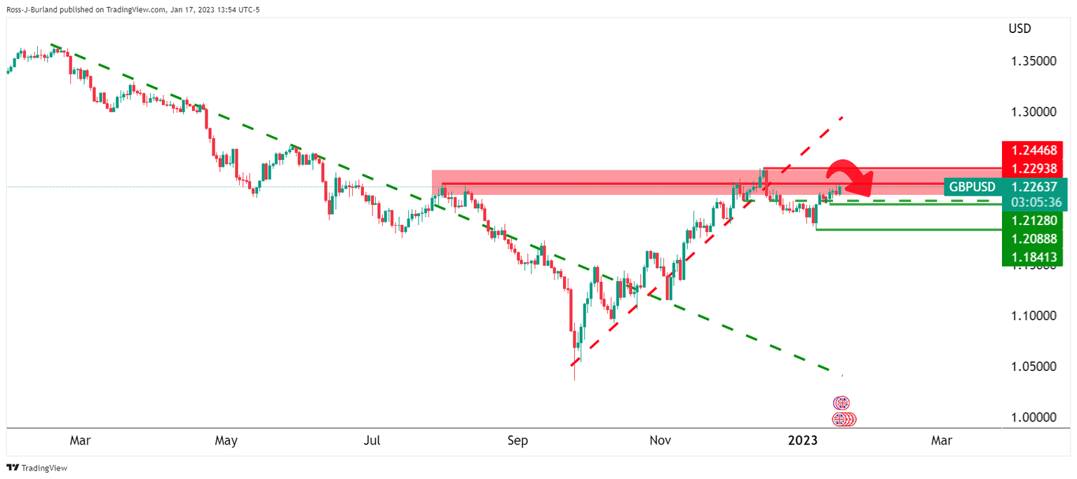 GBP/USD is higher by 0.6% at the time of writing, 14.00hrs New york time. The British Pound moved from a low of 1.2168 to a high of 1.2300 on Tuesday after Britain's Unemployment Rate data showed a tight labour market and accelerating pay growth. The Bank of England, BoE, is in focus in this regard as it battles with inflation at multi-decade highs.