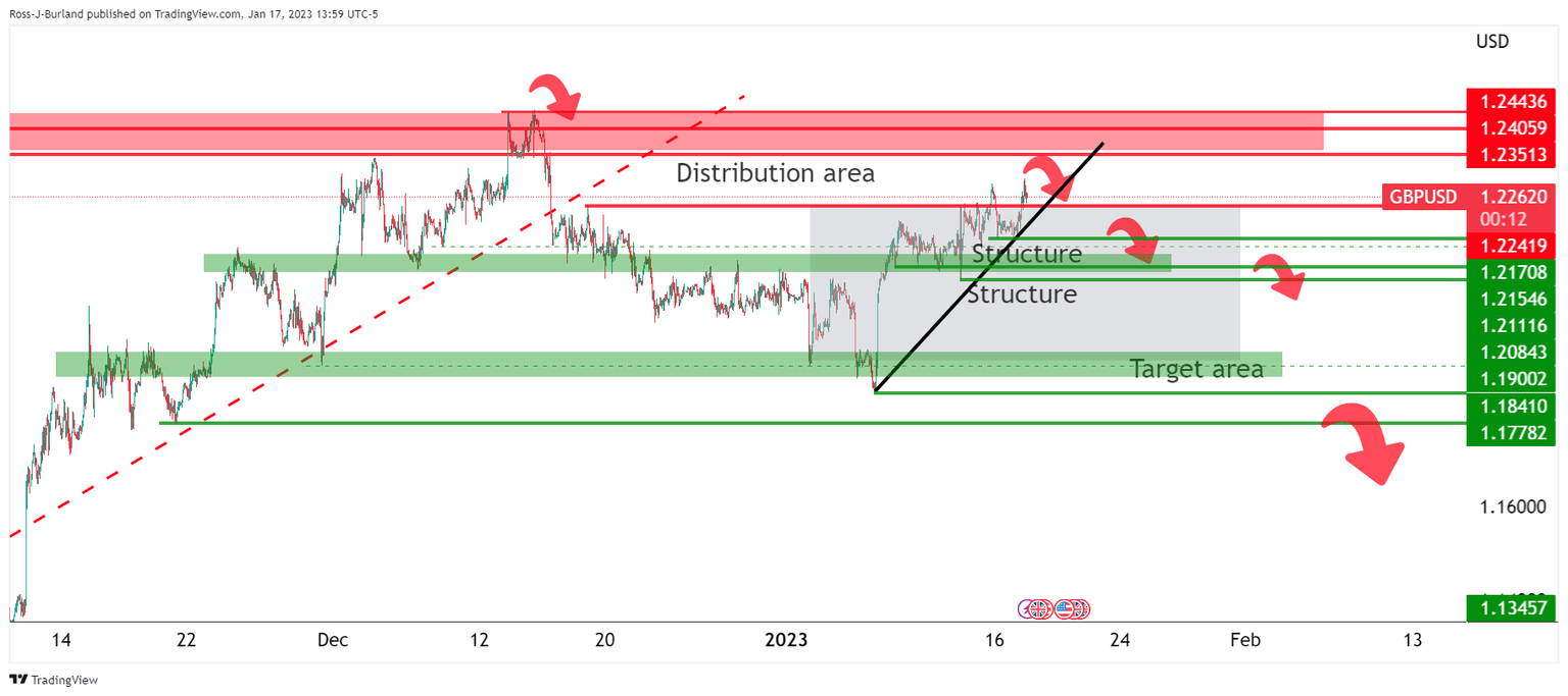 - GBP/USD bears eye a break of the solid trendline support and 1.2170 structure that could then result in a cascade of stops being triggered.