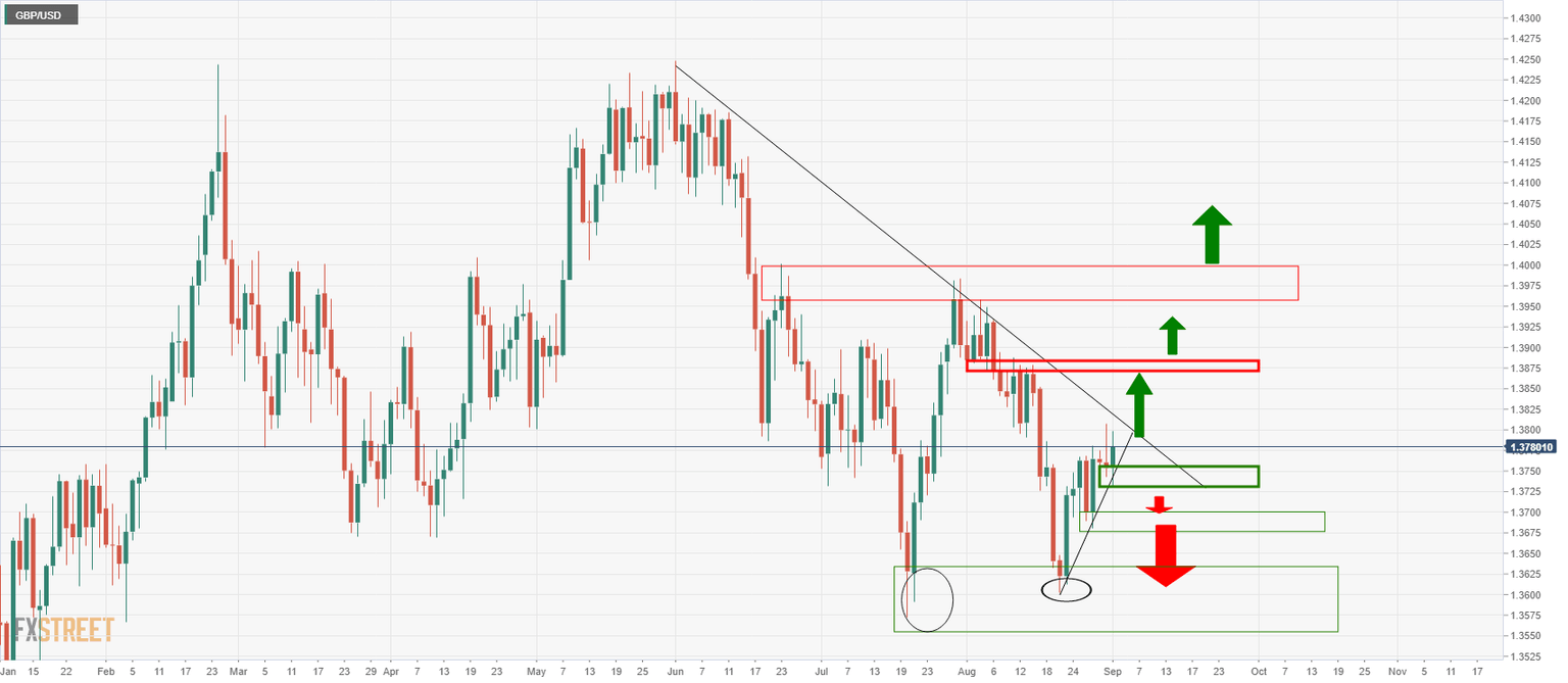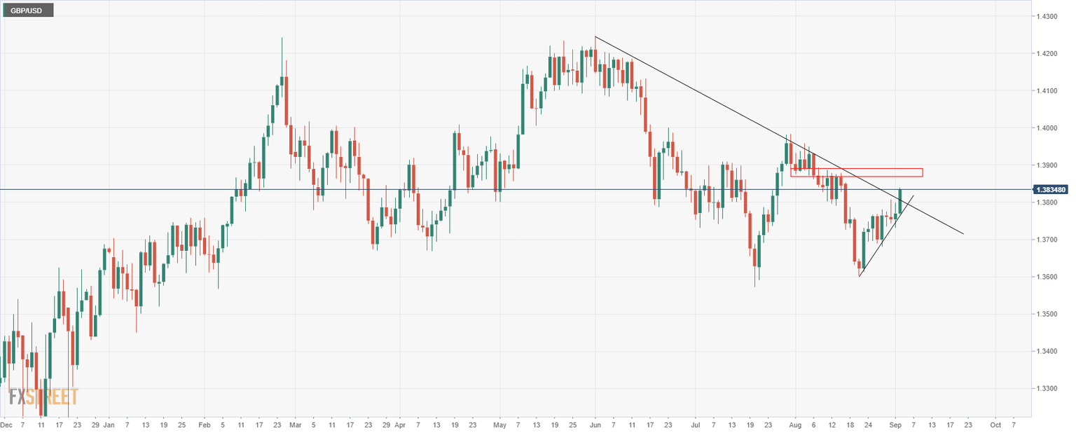 GBP/USD is trading at 1.3830 and is firmly through a critical dynamic resistance on Thursday's price action so far.