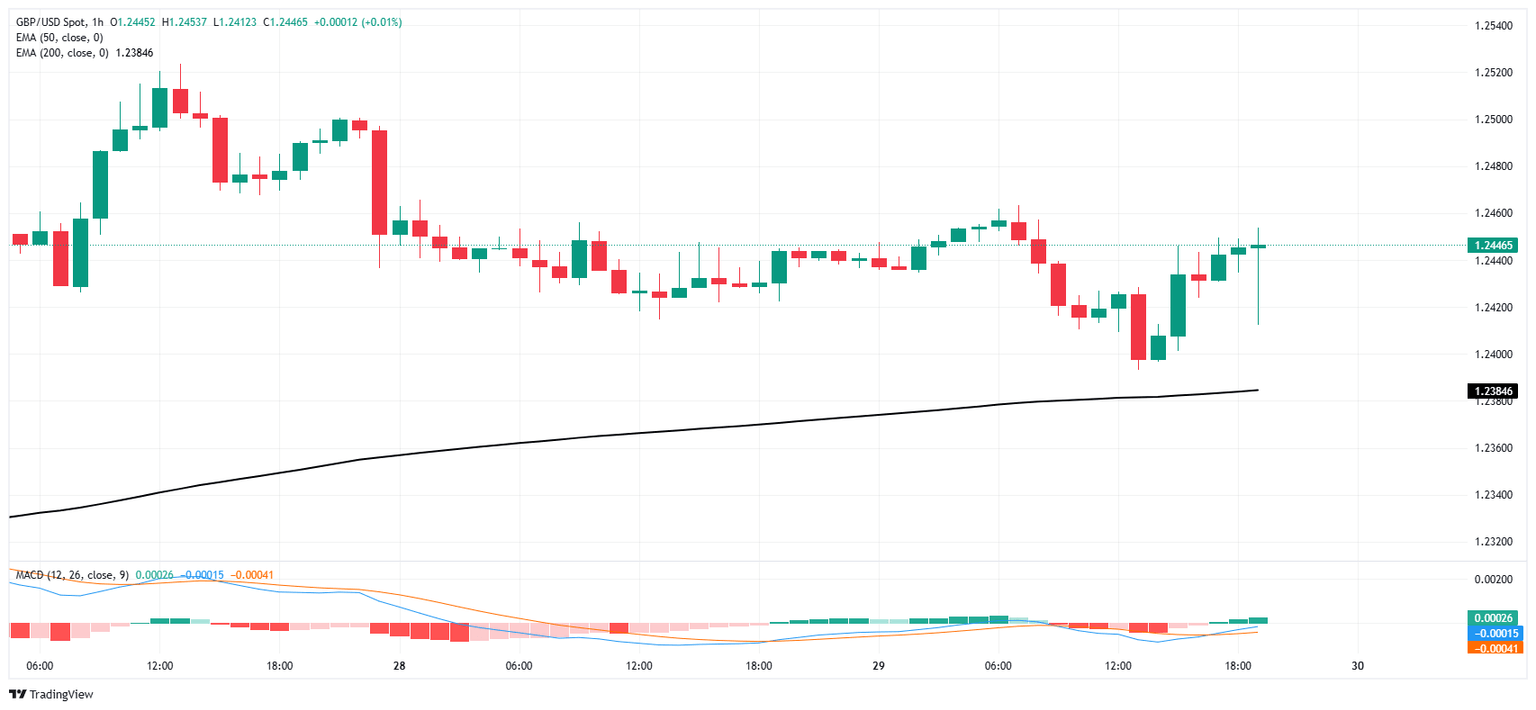 On Wednesday, GBP/USD fluctuated, dipping below 1.2420 before rising back to 1.2450 as the ongoing battle between bulls and bears resulted in less-than-noteworthy intraday volatility. The Federal Reserve (Fed) kept rates unchanged, as expected by rate futures markets, with Fed Chair Jerome Powell emphasizing their data-driven strategy for rate modifications.