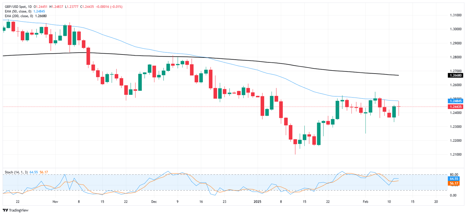 GBP/USD is coiled around 1.2450, churning the charts near middling technical ground as Pound Sterling traders await the UK’s latest Gross Domestic Product (GDP) growth figures. US Consumer Price Index (CPI) inflation accelerated in January, and markets will be watching Thursday’s US Producer Price Index (PPI) for signs of further inflation factors to be passed onto consumers.
