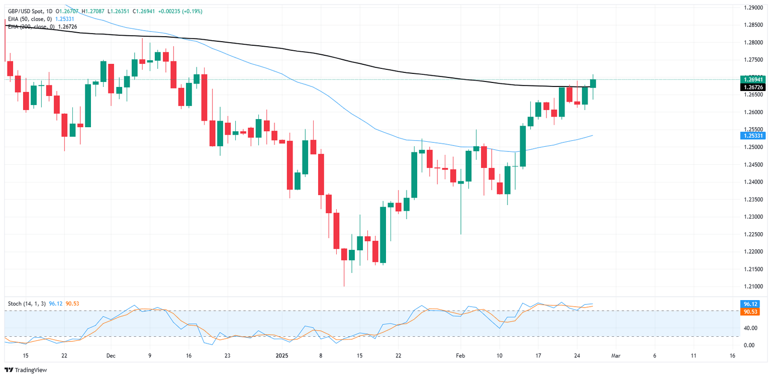 Wednesday's bullish push behind the Pound Sterling has bolstered GBP/USD above the 200-day Exponential Moving Average (EMA) at 1.2670, marking the first time bids have traded north of the key moving average since tumbling south of it in the middle of November 2024. Price action still needs to secure a close before the technical signal could imply further room to the upside, but momentum is firmly cooking to give the edge to bulls as Cable extends its 5% climb from the last major swing low into 1.2100.