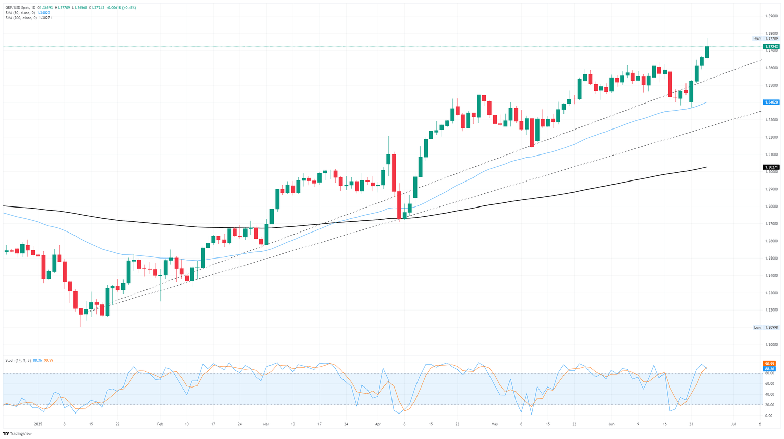 GBP/USD rose on Thursday, stepping into a fourth straight day of firm gains and clipping 44-month highs near 1.3770. A broad sell-off in the US Dollar is bolstering the Greenback’s major counter-currencies, helping to push Cable into its highest bids in nearly four years.