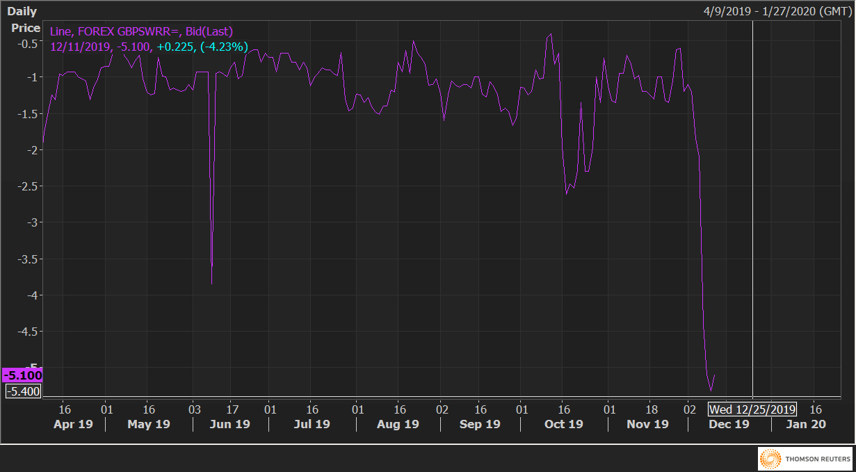 On Tuesday, one-week Sterling risk reversals, a gauge of calls to puts, fell to -5.32, signaling the strongest bearish bias since September 2016.