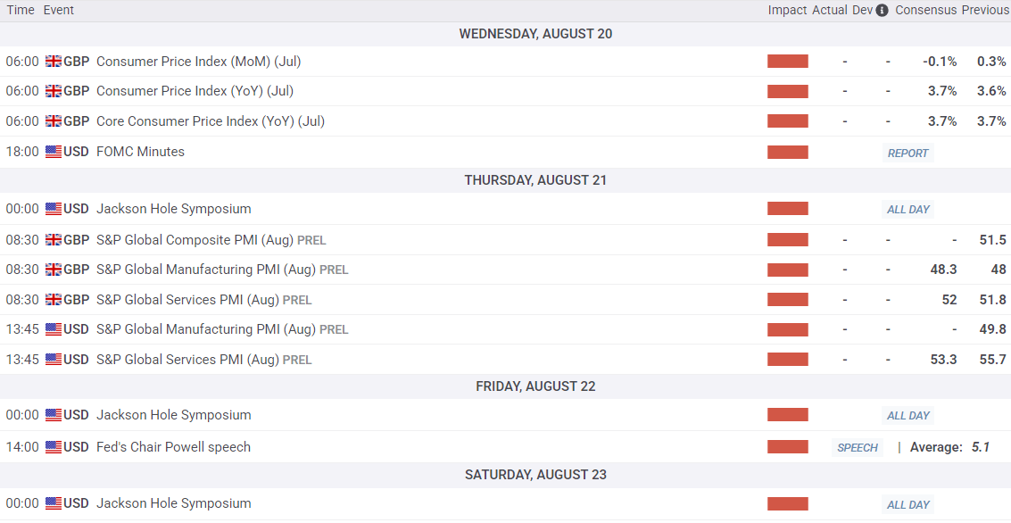 Global Purchasing Managers Index (PMI) will drop on Thursday for both the UK and the US, and this year’s Jackson Hole economic symposium also gets underway. UK PMI figures are generally expected to rise on both the services and manufacturing components, while a contraction in US services PMI figures is expected.