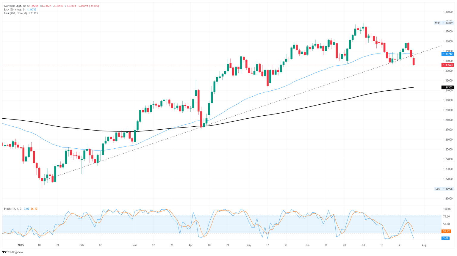 Cable weakness is back on the menu as downside momentum accelerates. GBP/USD is pushing back into the bearish side after flubbing a bullish push for the 1.3800 handle, failing to capture the key technical level in early July and pulling back into key moving averages below 1.3500. The pair has broken through a firm bullish trendline, and is now headed back toward the 200-day Exponential Moving Average (EMA) near 1.3130.