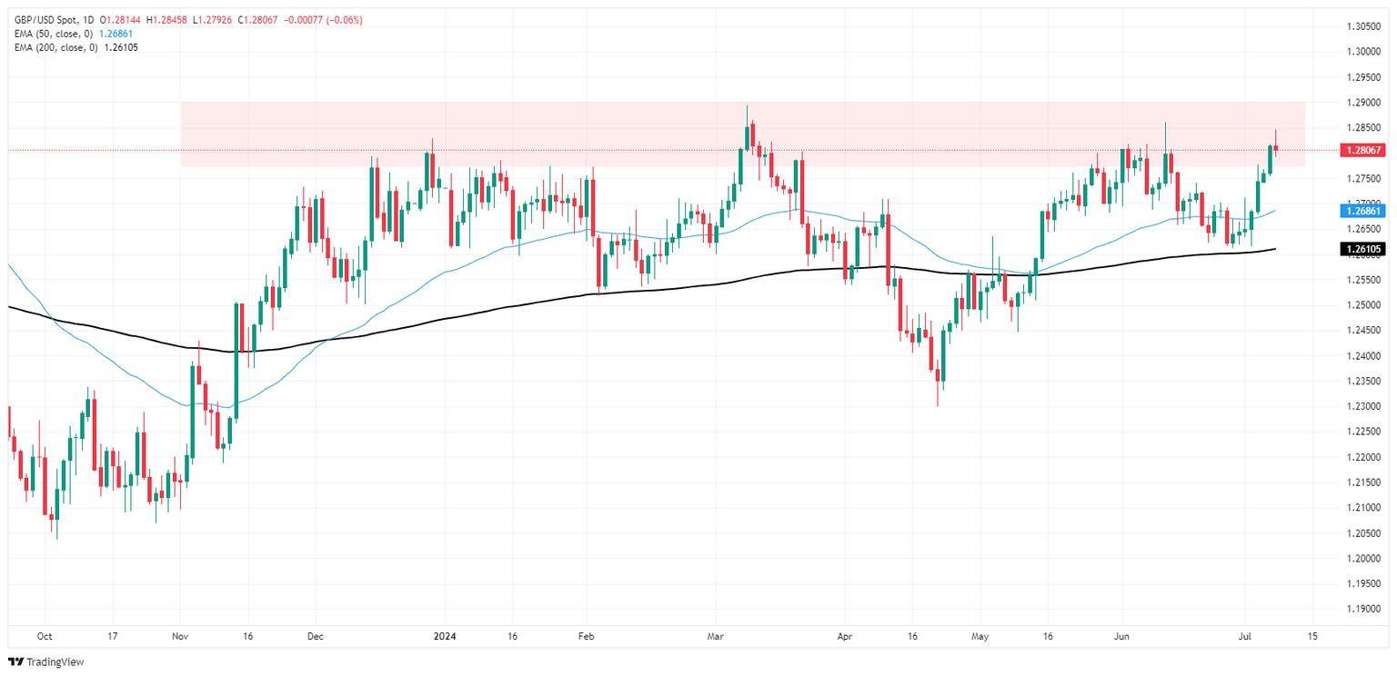 GBP/USD briefly tested a fresh four-week high on Monday, crossing above 1.2840 before broad-market flows dragged Cable back down to the week’s opening bids just north of 1.2800. UK data remains thin this week, leaving traders grappling with peaking rate cut hopes clashing with an overly-cautious Federal Reserve (Fed) that insists on waiting for further signs that US inflation will ease towards the Fed’s 2% annual inflation target.