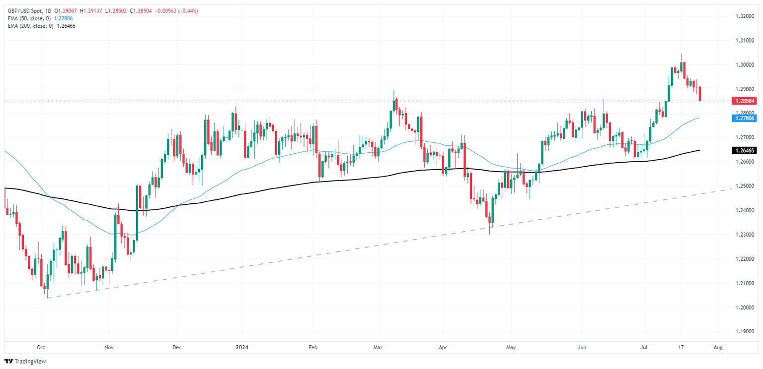 GBP/USD floundered on Thursday, chalking in a third straight trading day in the red and declining below 1.2860 as market expectations of a Bank of England (BoE) rate cut next week weigh down the Pound Sterling.
