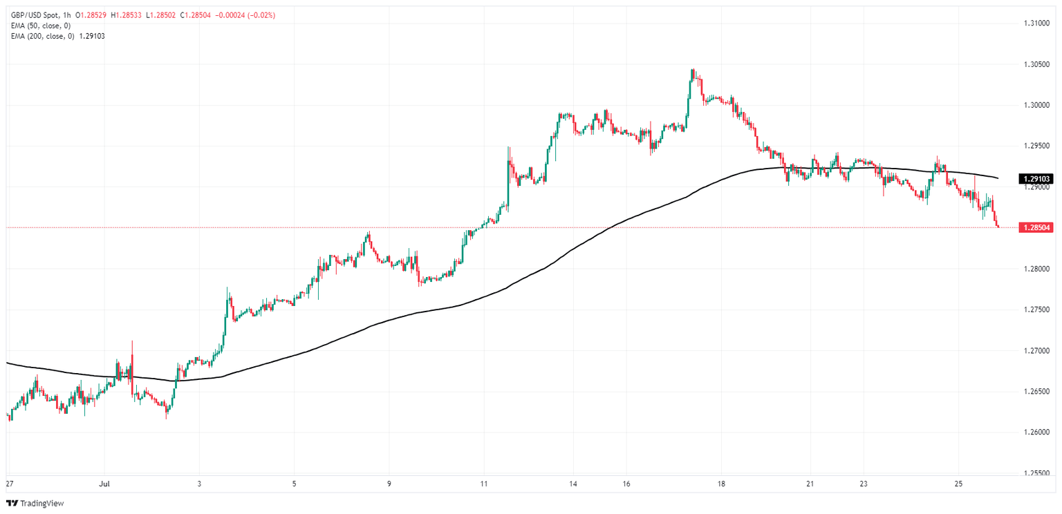 Cable has declined -1.5% and counting from last week’s 52-week peak near 1.3045, and the pair is on pace to close in the red for five of the last six straight trading days. Intraday trading has turned firmly bearish as GBP/USD drops away from the 200-hour Exponential Moving Average (EMA) at 1.2910.
