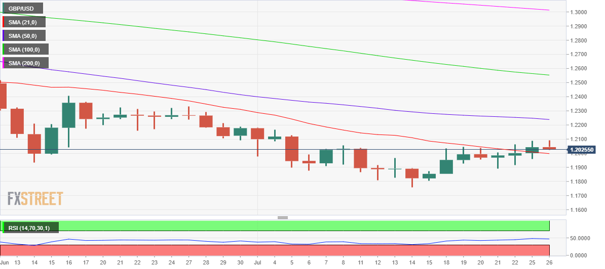 Looking at the cable’s daily chart, the pair closed Monday above the bearish 21-Daily Moving Average (DMA), then at 1.2006.