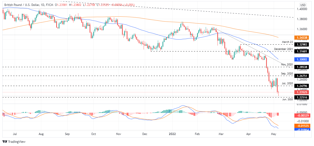 The British pound appears to regain composture but remains losing in the day, down 0.06%, after the Bank of England hiked rates by 25-bps on Thursday. At the time of writing, the GBP/USD is trading at 1.2352.