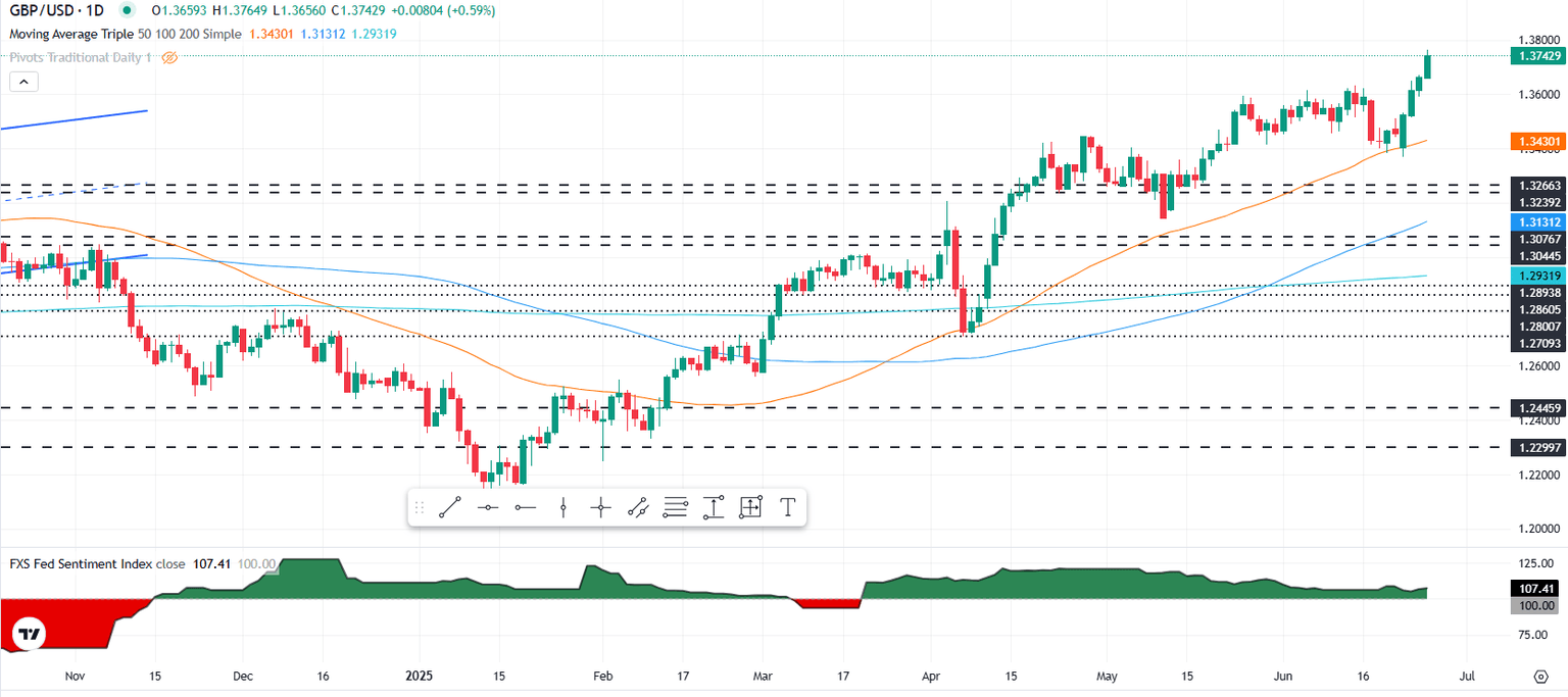The GBP/USD remains upwardly biased, having cleared the 2022 high of 1.3749, with further upside potential seen. Momentum, as measured by the Relative Strength Index (RSI), suggests that the trend could continue, as buyers are gathering momentum.