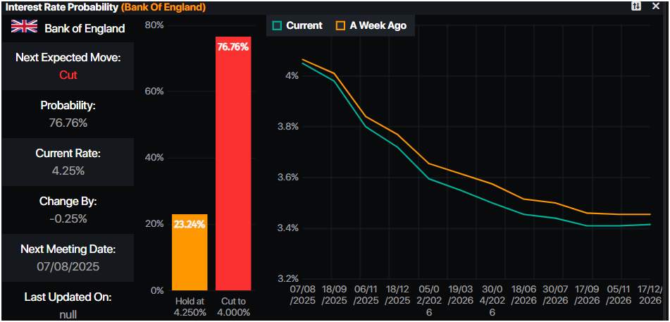 Market participants see a 76% chance of a rate cut from the BoE in August.