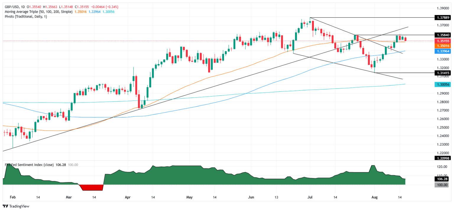 GBP/USD steadies during the North American session, down a minimal 0.08% amid a scarce economic docket on both sides of the Atlantic. Nevertheless, market participants are optimistic due to a possible ceasefire or a peace agreement between Ukraine and Russia, following the Trump-Putin meeting on Friday and ahead of the talks between US President Donald Trump and Ukrainian President Volodymyr Zelenskyy later on Monday. The pair trades around 1.3540 at the time of writing.