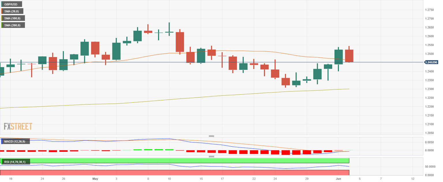 The GBP/USD holds a slightly bearish outlook for the short term, as per the daily chart. The Relative Strength Index (RSI) fell towards its midpoint while Moving Average Convergence Divergence (MACD) turned flat. However the pair still holds above the 100 and 200-day Simple Moving Averages (SMA) while bulls try to retake the 20-day rolling average at the 1.2460 zone.