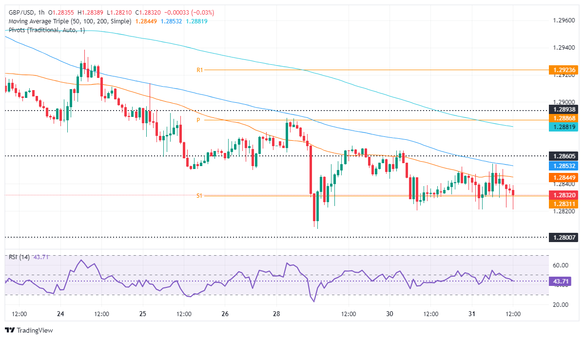 The 1-hour chart witnessed the GBP/USD diving to a new day low of 1.2819 yet has recovered some as market participants await Powell’s press conference, for any hints to ease policy.