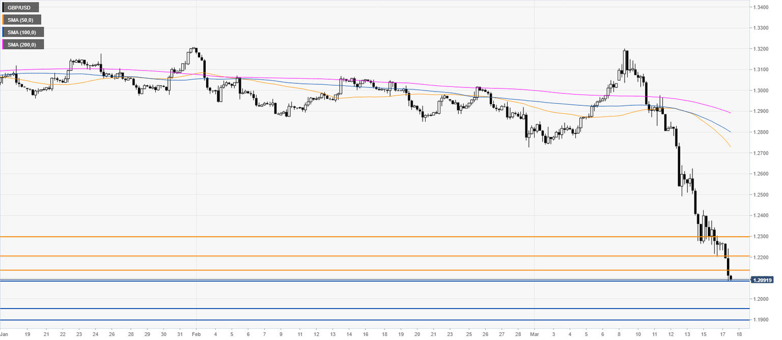 - GBP/USD is dropping sharply, now challenging the 1.2100 figure.