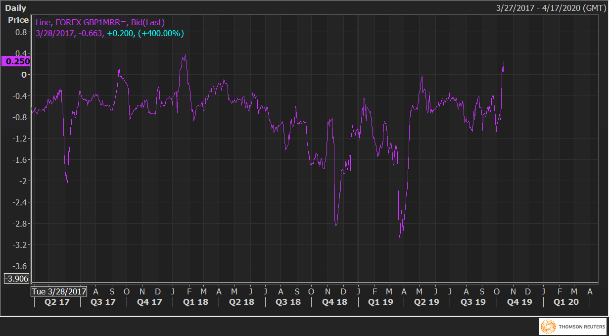 One-month risk reversals (GBP1MRR), a gauge of calls to puts on the GBP, rose above zero on Friday and currently stands at 0.25 – the highest level in 21 months.