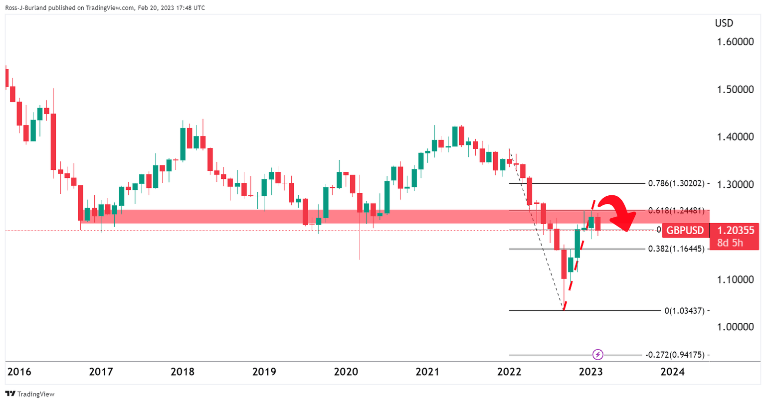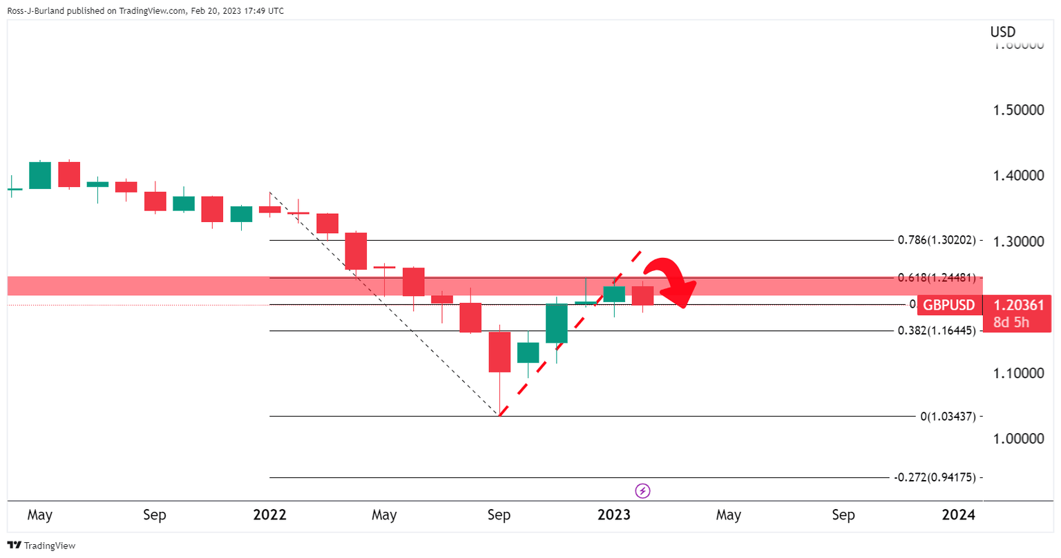 For some background, the pair has been capped where equal highs were put in near 1.2450 between mid-December and late January whereby the price corrected a strong monthly bearish impulse to a 61.8% Fibonacci of the range: