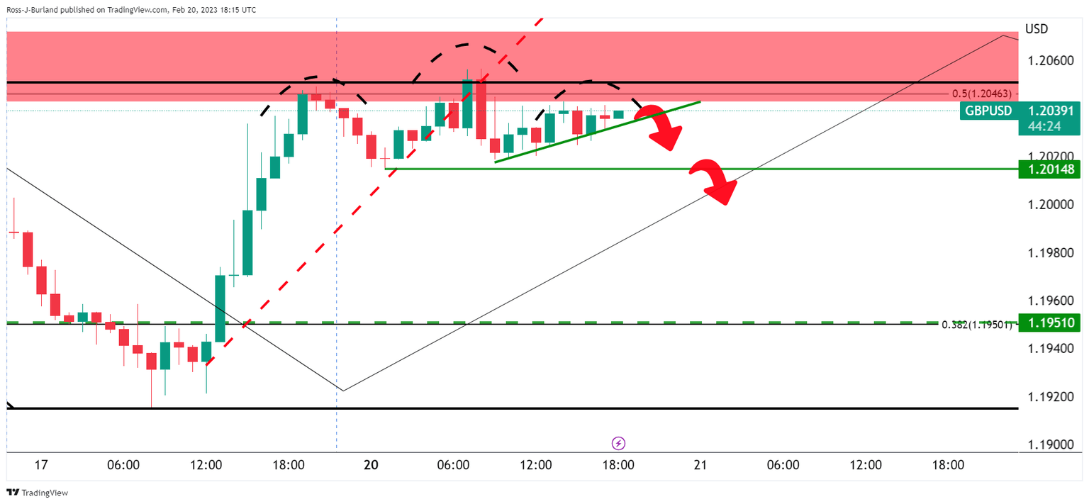 Currently, within the right-hand shoulder's formation, there is an M-pattern on the daily chart that is formed above where there was a break of structure, BoS, at the start of the year. The price has corrected the bearish leg of the pattern to a 38.2% Fibonacci level near 1.2050 and should this hold as resistance, at the neckline of the pattern, then a downside extension would be in order for a run to test 1.1850 territory for the days ahead.