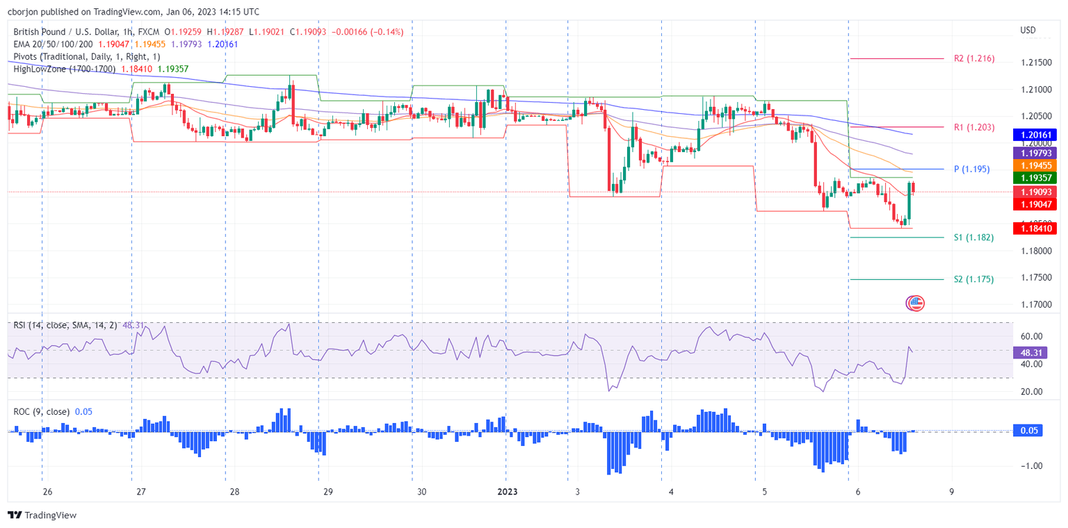 Per the GBP/USD 1-hour chart, the pair jumped from around 1.1850, rallying sharply towards the 1.1920 mark. On its way north, it cracked the 20-EMA at 1.1906, though it remained slightly shy of reaching the daily pivot point at around 1.1952. The Relative Strength Index (RSI) crossed above its 50 mid-line, while the Rate of Change (RoC) indicates buying pressure is building. Therefore, the GBP/USD key resistance levels would be 1.1952, followed by the 100-EMA at 1.1979 and the 200-EMA at 1.2016.