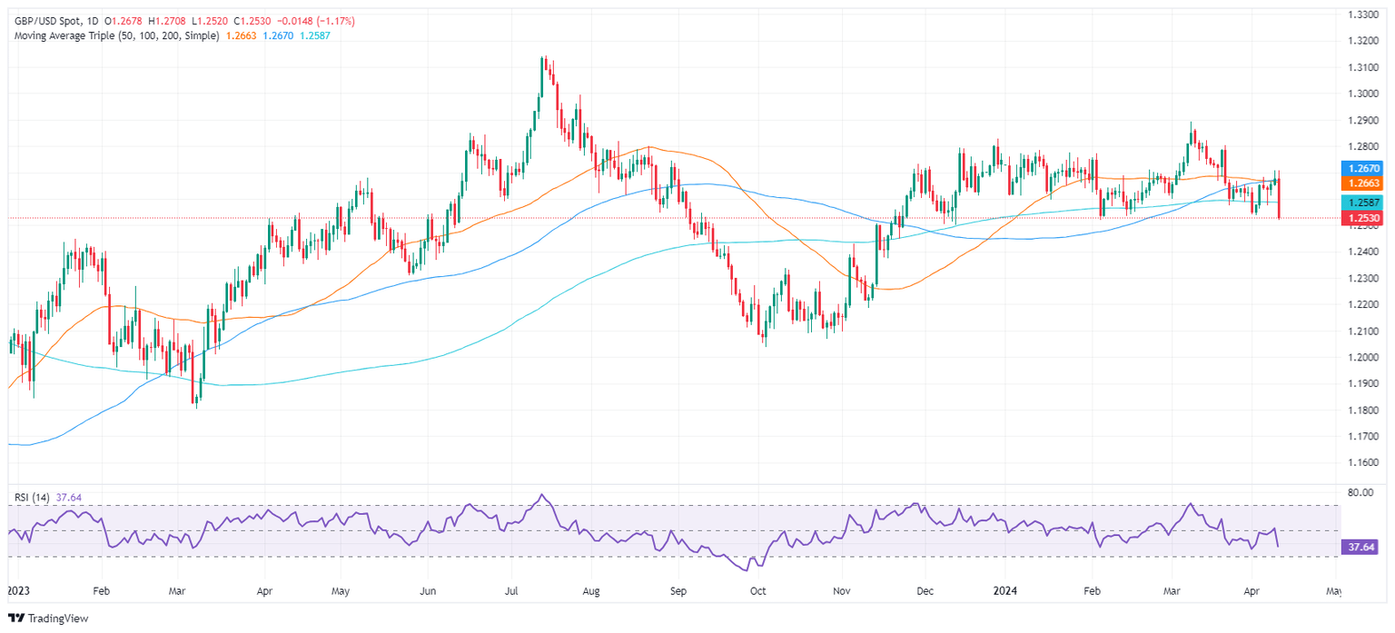 The Pound Sterling collapses late on Wednesday during the North American session, down by more than 1% against the US Dollar, following the release of US inflation data. Expectations for fewer rate cuts by the US Federal Reserve prompted a flight to the Greenback, which reached a new year-to-date (YTD) high via the US Dollar Index (DXY). The GBP/USD trades at 1.2534 after hitting a high of 1.2708.