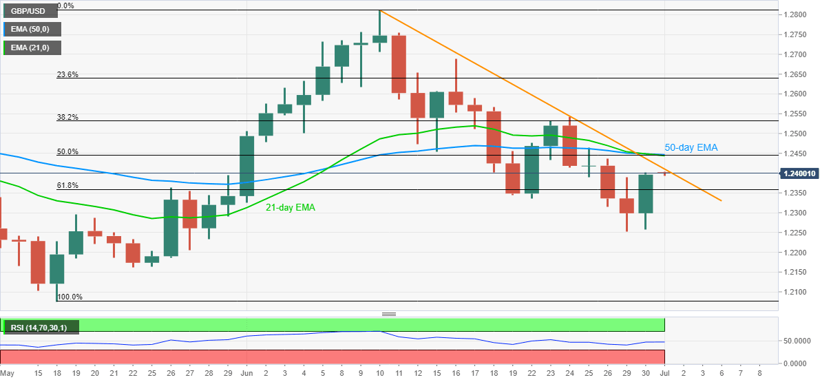 GBP/USD bulls catch a breather around the weekly top while trading near 1.2400 amid the early Asian session on Wednesday. The Cable printed heavy gains to cross 61.8% Fibonacci retracement of May-June upside the previous day.