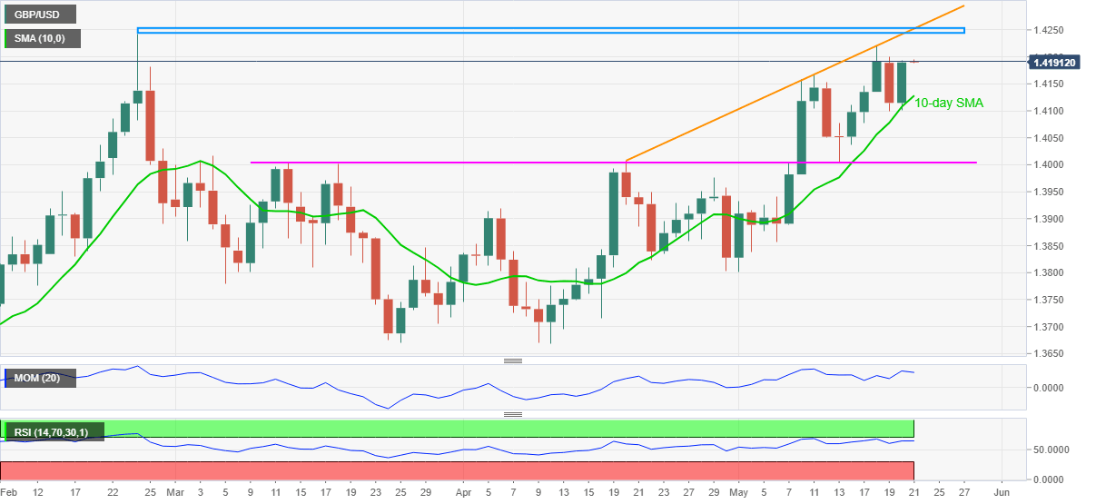 GBP/USD stays on the front foot around 1.4190 after the previous day’s heavy run-up during Friday’s initial Asian session. In doing so, the cable justifies its bounce from 10-day SMA to aim for the key hurdle around mid-1.4200. However, oscillators are likely testing the pair’s further upside.