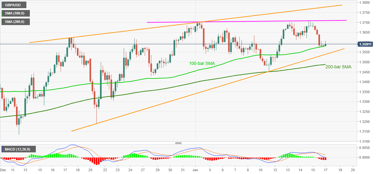 GBP/USD fails to keep the uptick beyond 1.3606, currently around 1.3590, during the initial Asian trading on Monday. The cable dropped to the lowest since January 12 on Friday but couldn’t slip beneath the 100-bar SMA. However, rising wedge formation on the four-hour (4H) chart joins bearish MACD conditions to keep sellers hopeful.