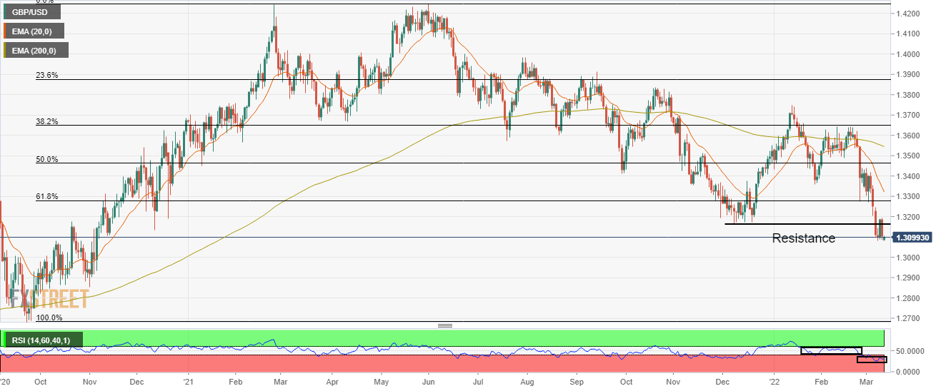 The GBP/USD pair has witnessed carnage amid broader risk-off impulse in the market. The pound bulls have been dumped almost 4% in the past 15 trading sessions. On Friday, the cable has registered a fresh 52-week low at 1.3082. The major prepares for a fresh weakness after slipping below 20 December 2021 low at 1.3174.