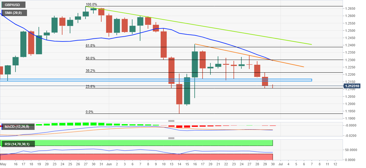 That said, the 23.6% Fibonacci retracement (Fibo.) of May-June fall, around 1.2100, challenge the quote’s immediate downside ahead of the 1.2000 psychological magnet.