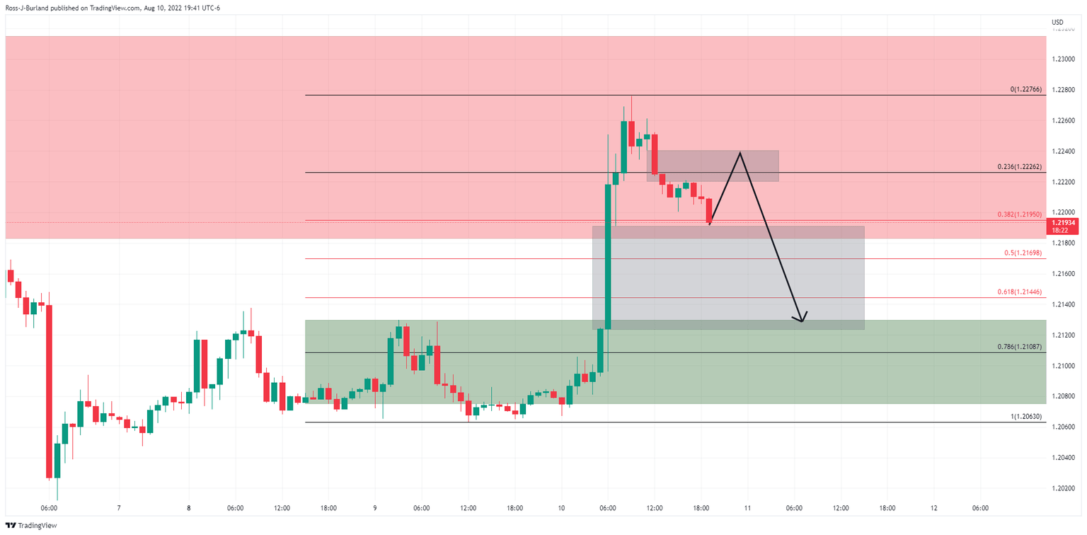 The price is moving to the downside following a strong rally to the upside on the back of the US inflation data. The Fibonaccis are in view for a move to mitigate the price imbalance to the downside that the rally has left behind on the hourly chart.