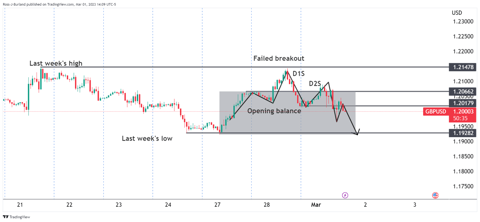 The topping pattern is more evident o the lower time frames with the head and shoulders engulfing the opening balance range for the week so far. There has been a failed breakout at last week's highs which tips the balance in favour of the sorts that came in at D1S, (Day 1 Shorts) on Tuesday. We are seeing D2S on Wednesday as the price breaks the prior day's lows and a bearish close could offer a sell-high opportunity on Thursday:
