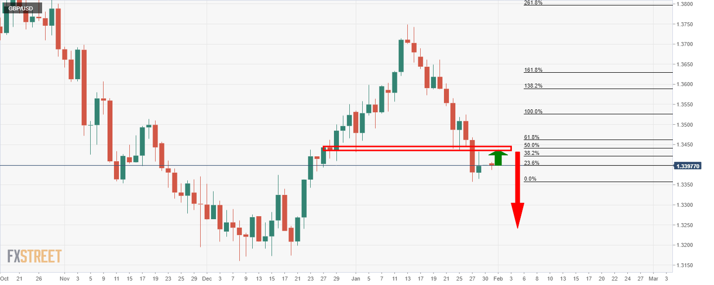 The following illustrated a bearish bias on the daily chart for GBP/USD. The bulls are correcting the bearish impulse on the daily chart and a move into retest old support near 1.3440 could on the cards for the sessions ahead. However, bears will be looking for a discount should the resistance hold initial tests: