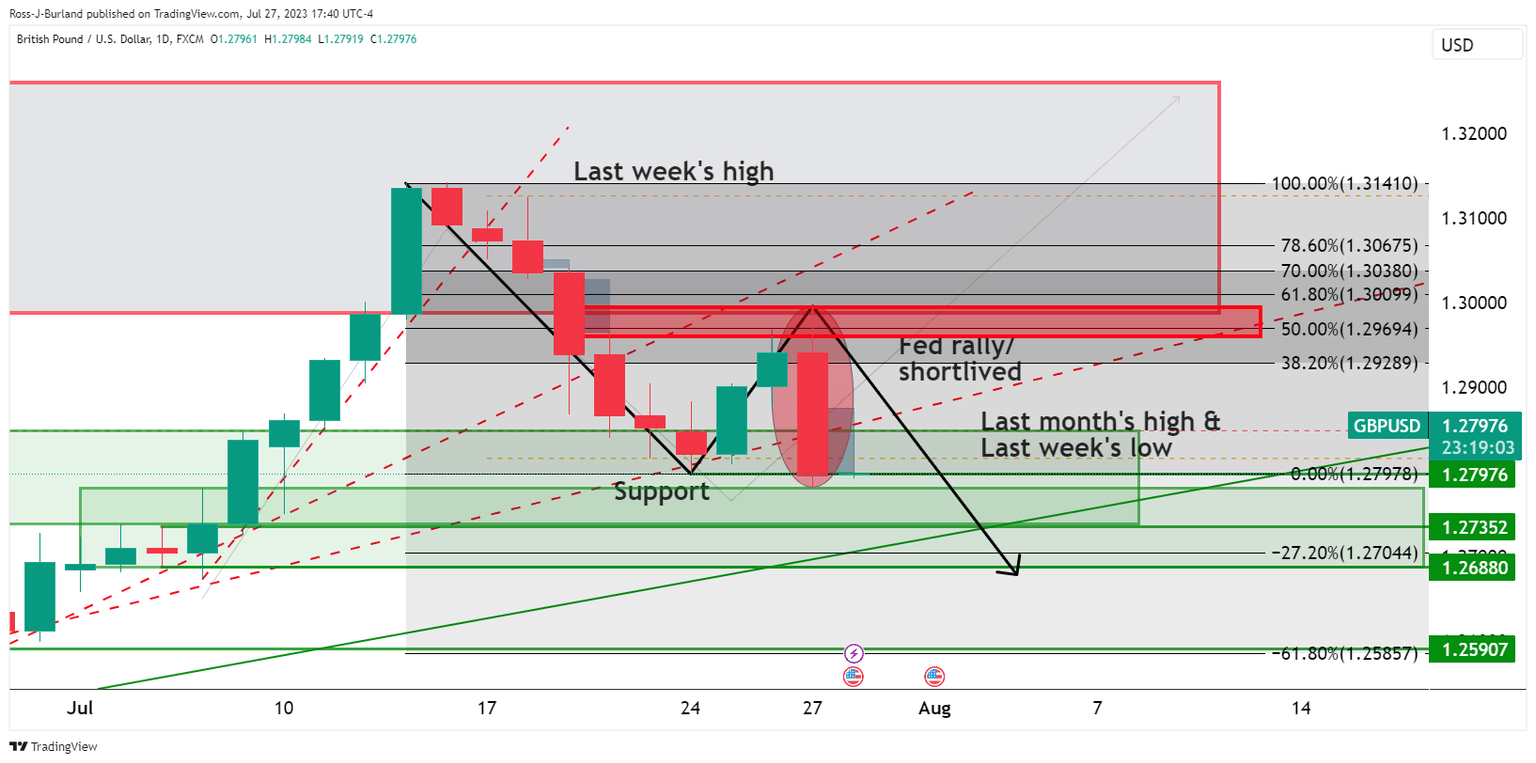 - GBP/USD bulls are under pressure following a rally in the Greenback.