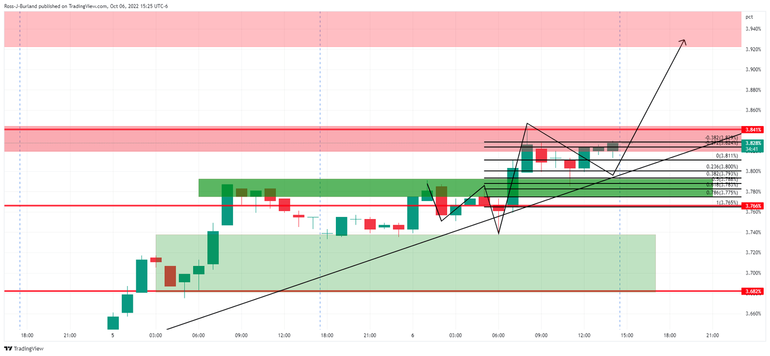The price has come up to test the trendline in a strong move through key Fibonacci levels. However, there is a daily price imbalance, as per the greyed area and while below resistance, the focus remains on the downside.