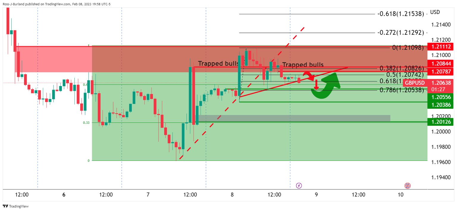 Therefore, if we assume that a bull trap has been laid, if only momentarily, then it is safe to presume that the market is headed for a test of a 1.2050s supporting area that has a confluence with the 78.6% Fibonacci as illustrated above. However, while above there, albeit with risks all the way to the price imbalance near 1.2010/20, the 38.2% Fibonacci is still a prospect for the day ahead and we could see bulls emerge again between 1.2050/1.2010.