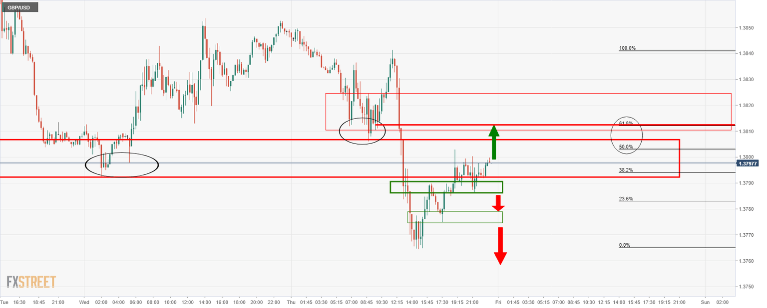 From a GBP/USD 15-min perspective, the bears will like to see the 1.3780s broken as confirmation of a higher probability that the correction is over and a continuation to the downside is on the cards.