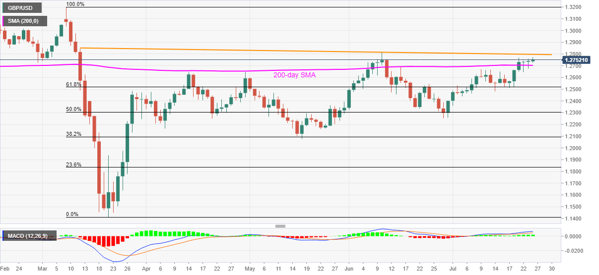 GBP/USD takes the bids near 1.2765, up 0.20% on a day, during the early Friday. The Cable surges to the multi-day high while keeping its trade momentum above 200-day SMA amid MACD. As a result, bulls are likely to attack 1.2800 comprising the resistance line stretched from March 12.