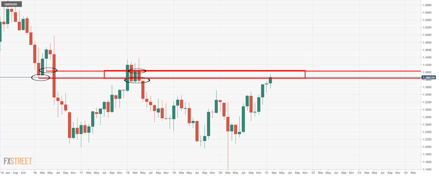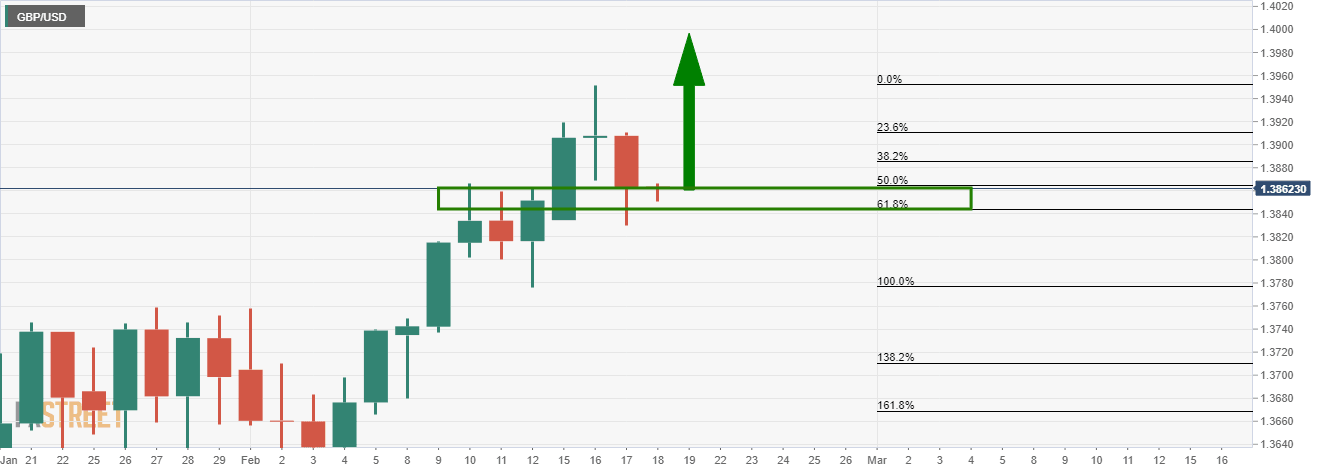 Further to prior analysis of mid-December 2020, GBP Price Analysis: A a break of critical 1.3514 exposes low volume nodes to 1.3820, the upside towards current levels was forecasted on a daily chart as follows: