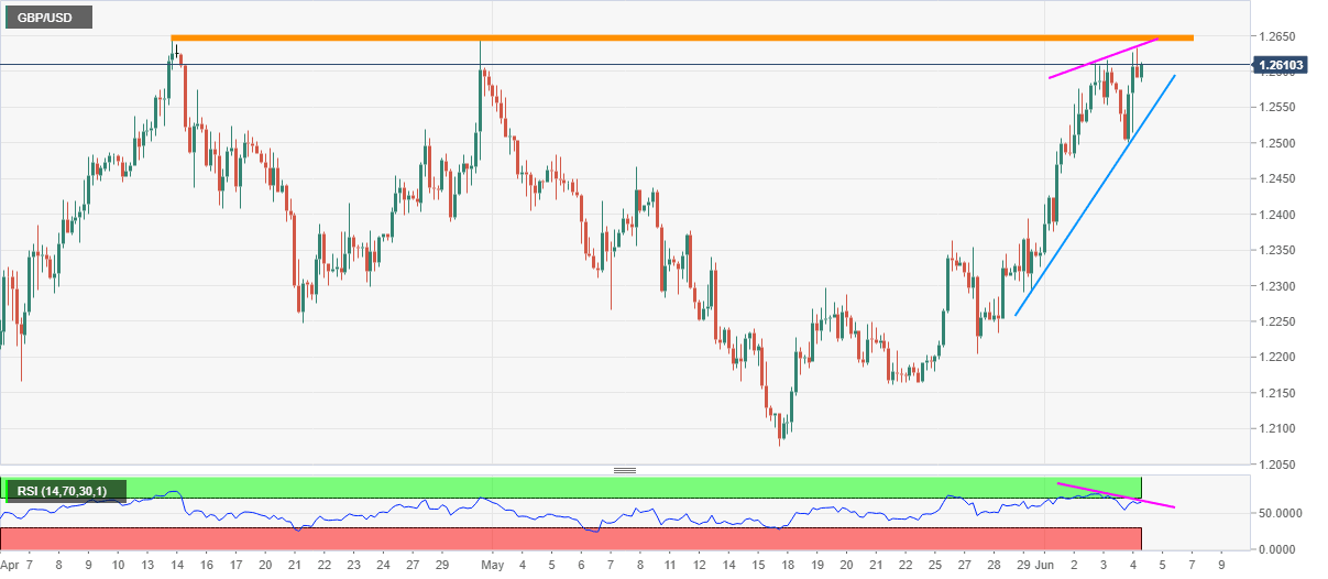 GBP/USD prints 0.11% gains while taking the bids near 1.2610 during the early Friday’s Asian session. Even so, the Cable stays below the 1.2640/50 horizontal area comprising highs marked in April month.