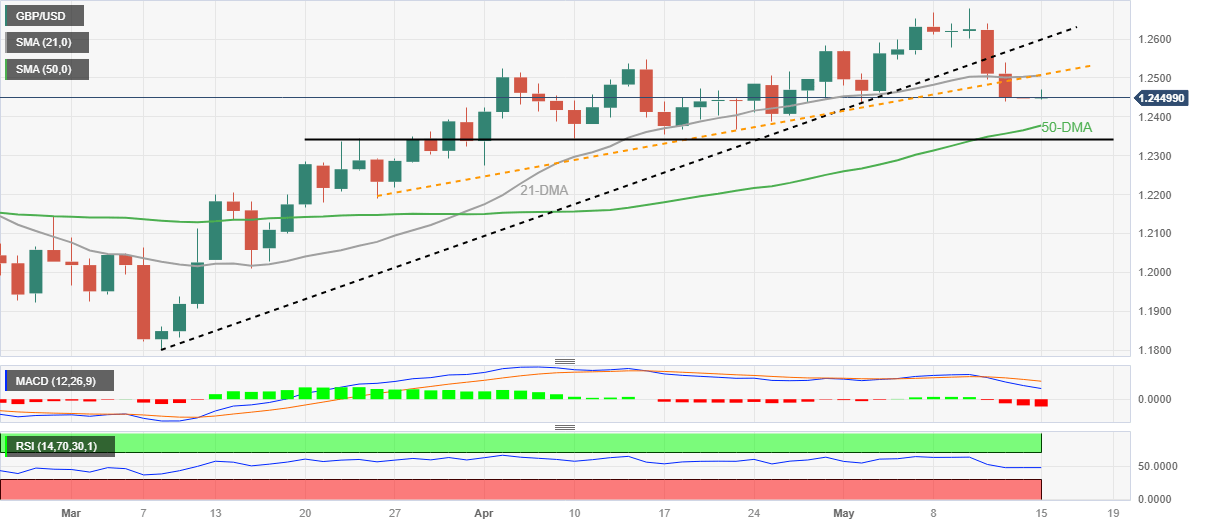 On the contrary, a convergence of the 21-DMA and an upward-sloping trend line from March 24, around 1.2510 at the latest, restricts immediate recovery of the GBP/USD pair.