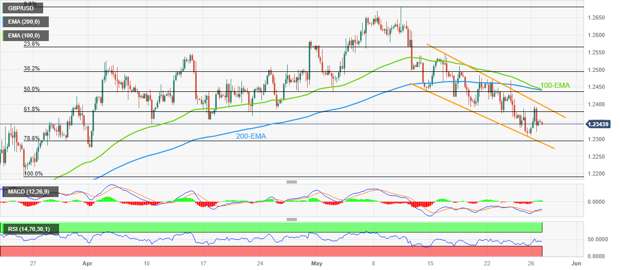 That said, the near 50.0 levels of the RSI (14) and bullish MACD signals prod the GBP/USD bears and can allow them to target the 61.8% Fibonacci retracement of the upside from late March to early May, close to 1.2380 by the press time.