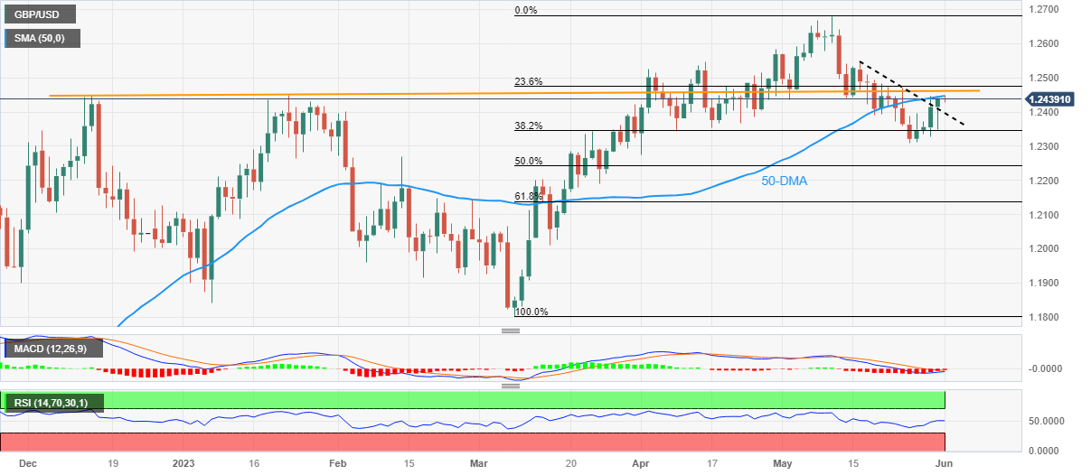 Although the aforementioned catalysts suggest the GBP/USD pair’s run-up beyond the 50-DMA immediate hurdle of around 1.2450, an upward-sloping resistance line from late 2022, close to 1.2465 by the press time, could challenge the Cable pair buyers afterward.
