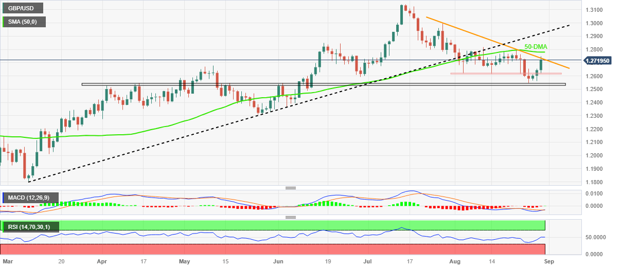 GBP/USD buyers attack a downward-sloping resistance line from late July as they await the key US inflation gauge while pausing the three-day uptrend amid early Thursday morning in Asia. In doing so, the Cable pair seesaws around the 1.2720 level while defending the previous week’s rebound from a five-month-old horizontal support zone.