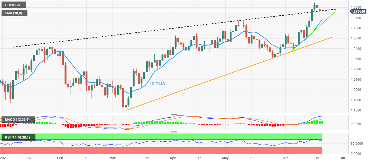 GBP/USD fades corrective bounce off weekly low as it retreats to 1.2760 amid the early hours of Wednesday’s Asian session, sidelined of late. In doing so, the Cable pair inability to defend the previous week’s upside break of a five-month-old resistance line amid the overbought RSI conditions. It’s worth noting that the Pound Sterling’s latest inaction could be linked to the market’s cautious mood ahead of the UK’s top-tier inflation clues including the Consumer Price Index (CPI) for May.