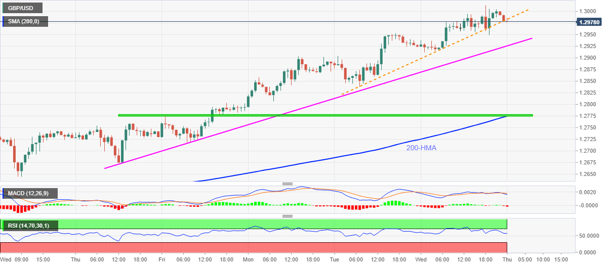 GBP/USD eases to 1.2980 during Thursday’s Asian session. In doing so, the Cable takes a U-turn from the highest since the early March while cheering the break of the immediate support line. Also suggesting further pullback is the bearish MACD signal and downward sloping RSI.