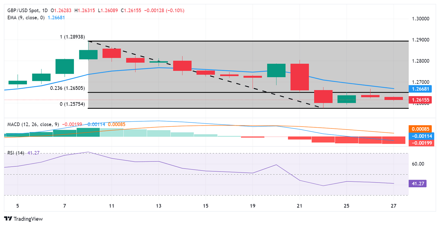 GBP/USD extends its losses for the second consecutive day, depreciating to near 1.2620 during the Asian session on Wednesday. The pair could test the psychological support level of 1.2600. If this level is breached, it could prompt the pair to revisit March’s low at 1.2575.